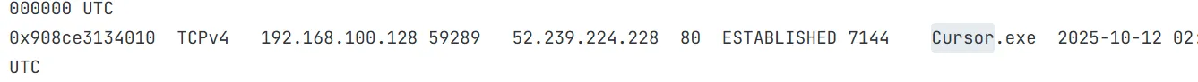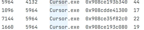 LLM起手,先用Volatility列一下进程列表(vol -f mem.dmp windows.pslist.PsList)找Cursor.exe的pid,发现